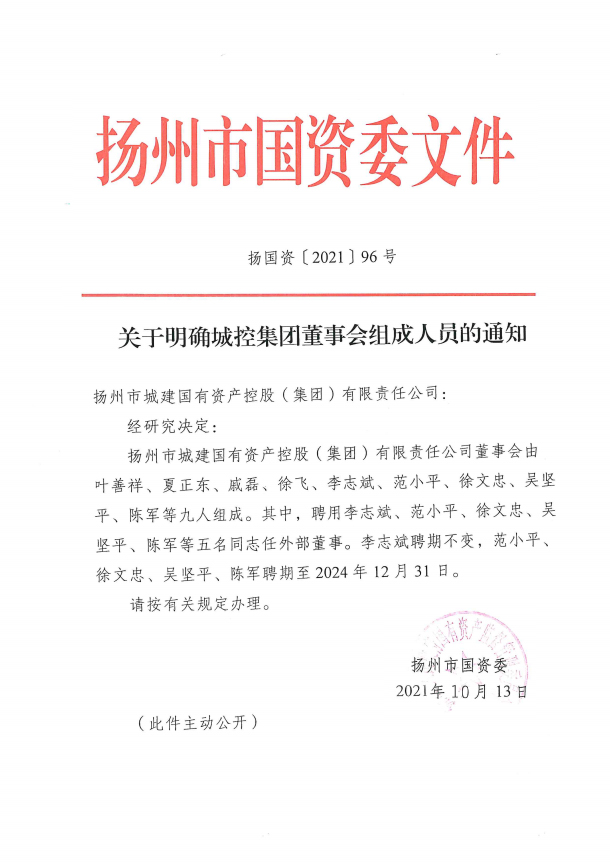 關于明確城控集團董事會組成人員的通知