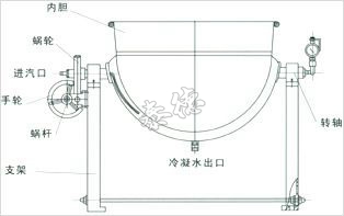 夾層鍋可蒸、煮、浸提、濃縮中藥,也可用于制作蜜丸中的煉蜜。夾層鍋由主體、支架、蝸輪、蝸桿等組成。夾層通入蒸汽加熱,或者使用電加熱。